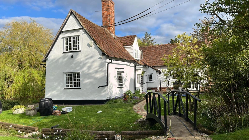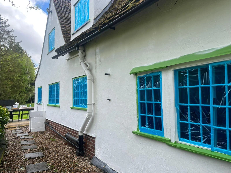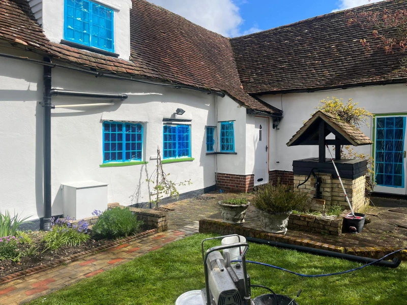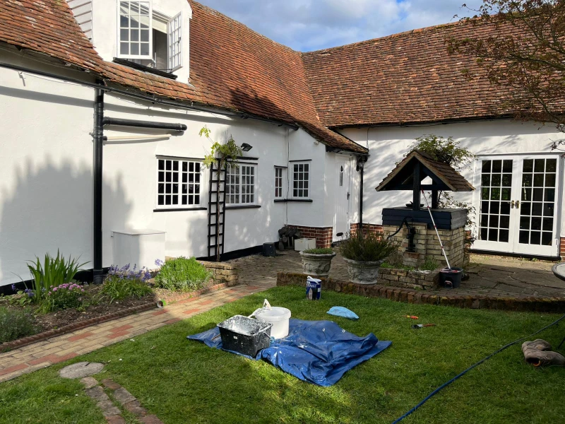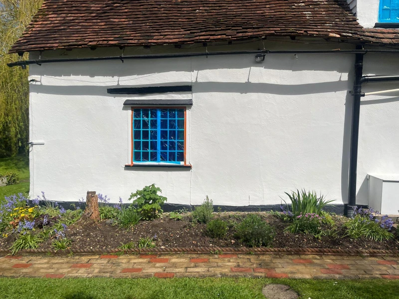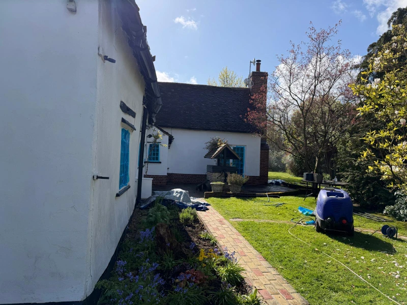 The transformation began with a rigorous preparation phase, involving deep cleaning and a specialized biocide treatment to eliminate microorganisms and prevent future regrowth. Our team meticulously handled essential repairs, including brickwork touch-ups, crack sealing, and the sanding and painting of external woodwork. This groundwork ensured that the subsequent application of the ProPERLA Façade Coating would adhere perfectly, providing a breathable, water-repellent barrier that enhances the cottage’s character while shielding it from the elements.